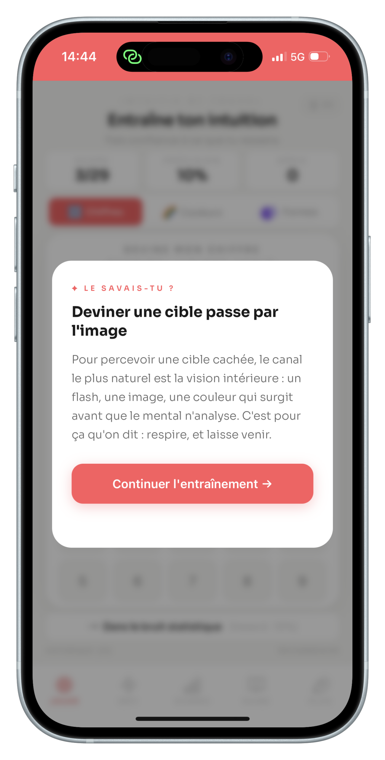 L’app ne promet pas de te rendre médium. Elle t’entraîne à écouter tes premières impressions plutôt que ton mental. Les premiers résultats surprennent souvent, à toi de voir ce que tu vas découvrir sur toi !